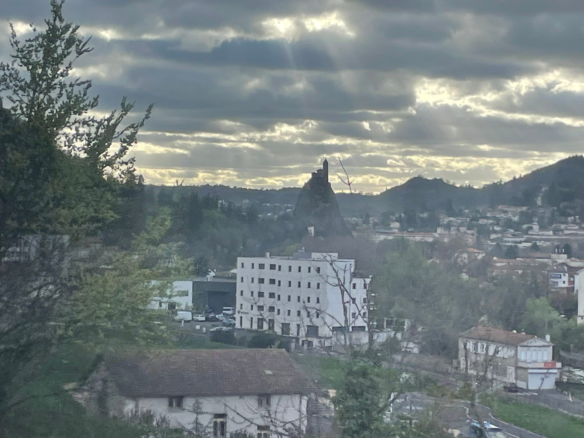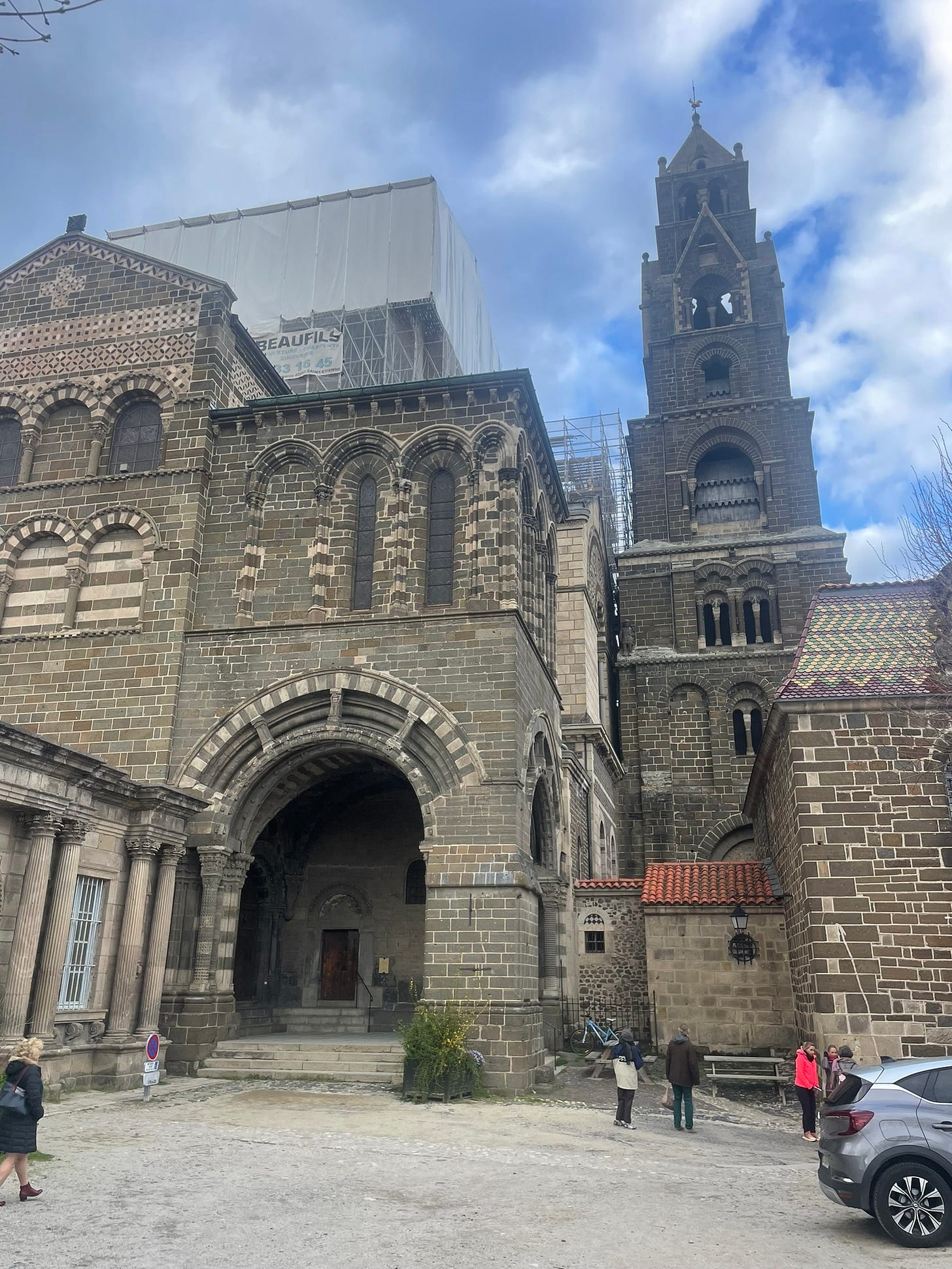 What is Puy now – it is twinned with Tonbridge, which they mistakenly call ‘Tonbridge and Malling’ on the sign at the entrance – Puy has less charm than that city, less charm and more tourists. I will begin with its defence; it’s always interesting to see genuine mass religiosity, and Puy is stuffed with mediaeval seeming characters like pilgrims and nuns –– to some tastes the churches may be beautiful ––– all can admit they are set remarkably on their hills. Smith, Pound and everyone else point out it looks Spanish, southern Spain in particular, apparently the cathedral very similar to a mosque in Cordoba. But whatever the charms of that southern city, here it doesn’t work –– Velay a high plateau, green with cows and forests ––– the black stripes and crenellations seem absurd, alien. The overall mood of the town is subdued, I was there once as a child in summer and it was frenetic – or at least was so in my imagination – but in April the city is dead. Puy, whatever else we say about it, is perhaps the only French city where I didn’t see a kebab shop.