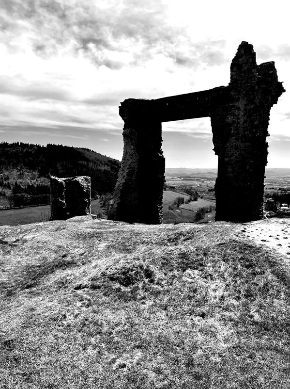 Ez quotes Bernard de Ventadorn here – calling him, in a bizarre backhander to Guillaume IX, Marcabru and a handful of others, the first great ‘finder’. This opinion, as Ez’s sometimes are, is indefensible, and I doubt even he would’ve defended it a few years later, coming as it does in The Spirit of Romance (1910), and before long eulogies on Arnaut Daniels, Bernard’s effective opposite. Ez may have been a victim of his own focused reading. But it’s a nice poem, the lark letting himself fall, and I was pleased to cross a few fields of them on the way to Allègre. Allègre is perfectly set, tucked next to a volcano with the gallows visible from many kilometres at the high point of the village. For various reasons – the front cover of the published version of Ez’s notes, the last Canto, etc etc – I had decided this was the main portal to the south, and the high point of my journey, but it still seemed unfamiliar in person, larger than I’d imagined, in better repair; but a highly functional portal nonetheless. Foolishly, I crossed it from south to north and afterwards lost all interest in my subject.